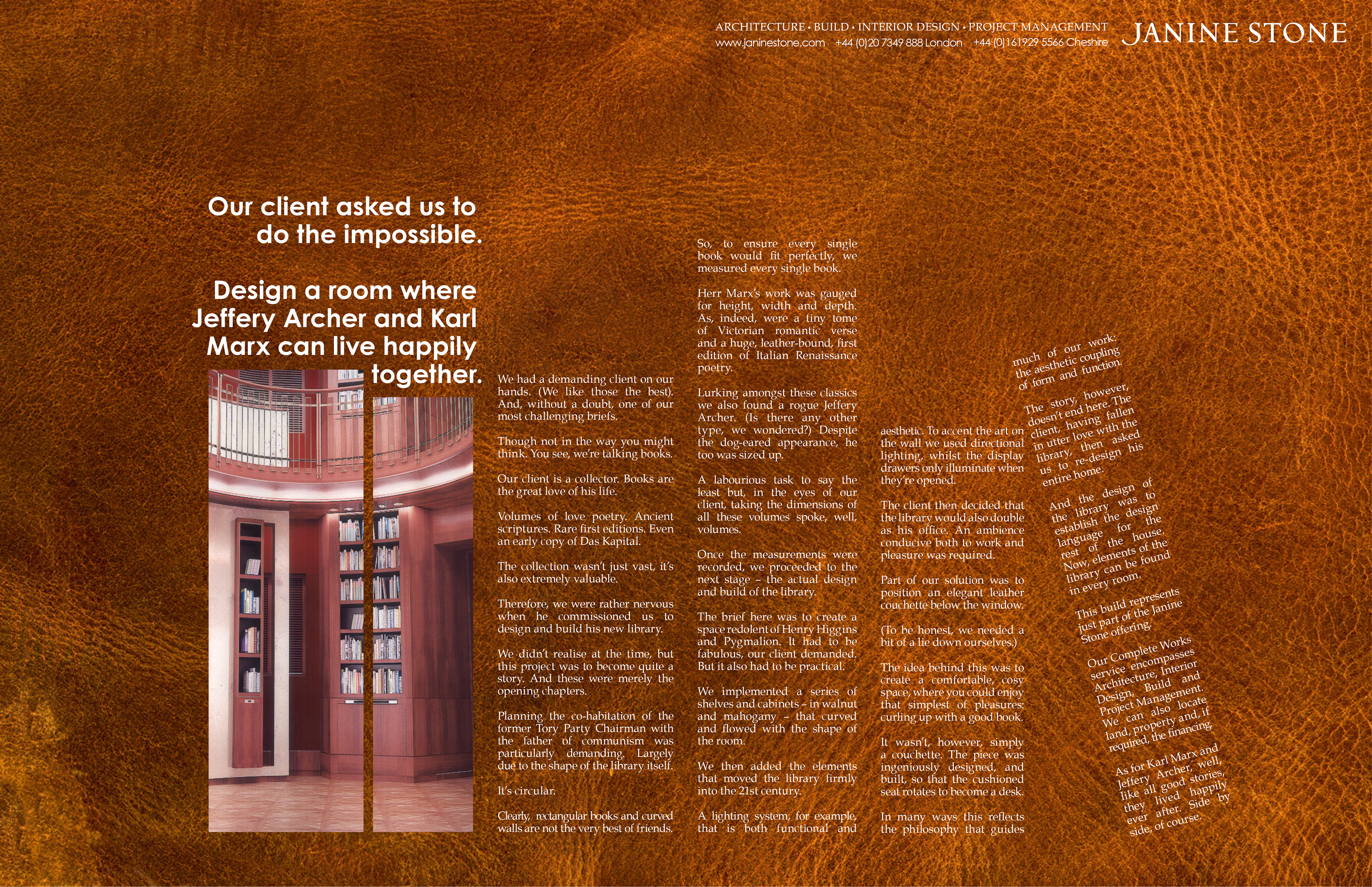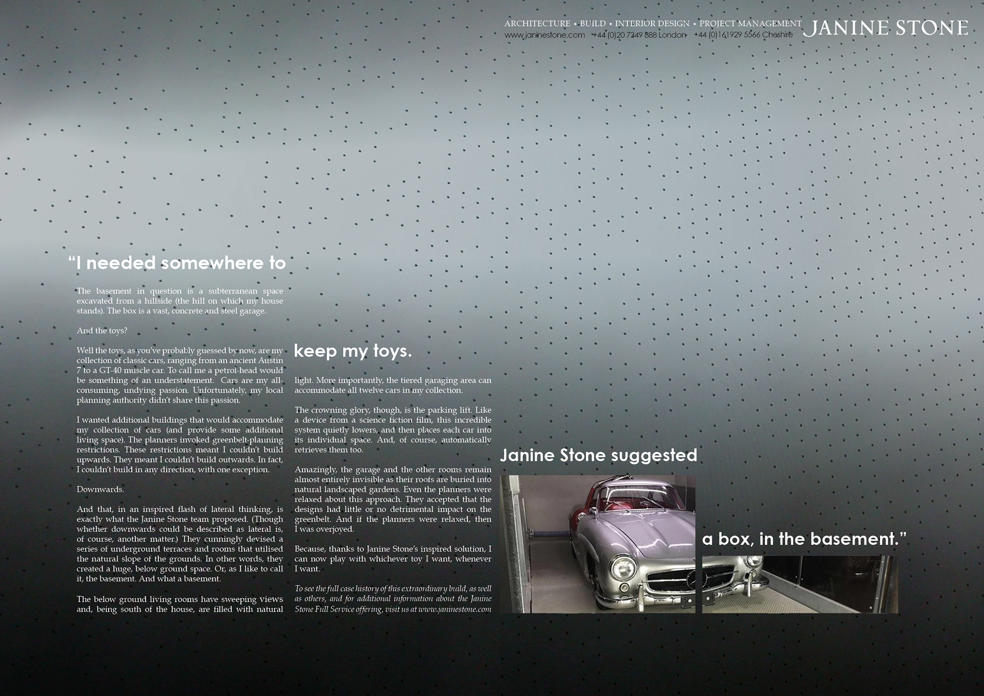 PRESS Janine Stone is an exclusive Architectural studio. They create impressive spaces for clients with very deep pockets. We were asked to create an idea that focussed on their quality offering, but we saw more potential in the back stories to their clients' problems and how they solved them.