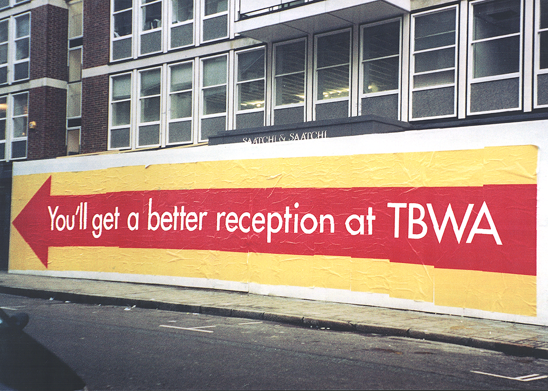 STUNT • CONTENT The brief was to promote TBWA\London after the agency made it into The Sunday Times Top 100 companies to work for. Saatchi & Saatchi were having their main entrance refurbished. They foolishly put up a sign: BILL POSTERS WON'T BE PROSECUTED. TBWA were just around the corner. AWARDS: 2 X D&AD Annual entry The One Show - Best Viral Bronze Creative Circle - Best viral